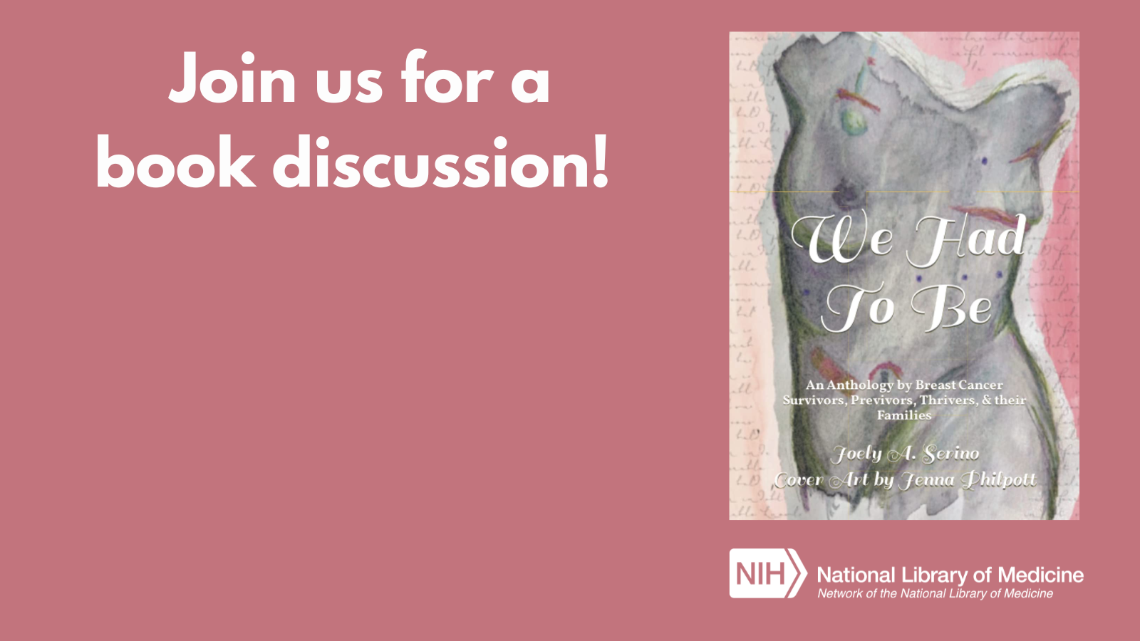 Book descriptionHearing the words, "You have breast cancer,” is a devastating blow. To help process their experience and to cope, many individuals turn toward writing and the arts to express themselves and their feelings during this tumultuous time. We Had To Be: An Anthology by Breast Cancer Survivors, Previvors, Thrivers, & their Families, curated and edited by Joely A. Serino, is filled with the writings and artwork of over 30 individuals from more than 8 different countries sharing how breast cancer touched their lives and changed them.
